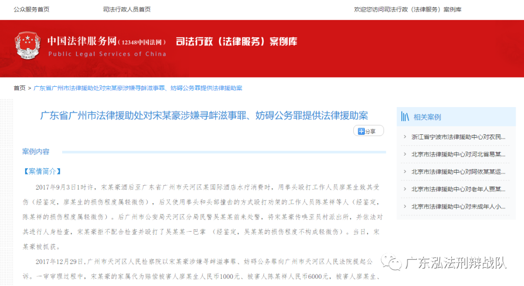 广州市天河区人民法院于2018年3月23日作出判决(2018)粤0106刑初13号刑事判决书,判处宋某豪犯寻衅滋事罪,判处有期徒刑六个月;宋某豪犯妨害公务罪,判处有期徒刑七个月。数罪并罚,决定执行有期徒刑十个月。判决后,宋某豪认为一审判决量刑过重,提起了上诉。2018年4月23日,广州市中级人民法院依据广东省高级人民法院与广东省司法厅联合制定的《关于开展刑事案件律师辩护全覆盖工作的实施办法(试行)》的规定,通知广州市法律援助处为宋某豪提供法律援助,广州市法律援助处指派广东广信君达律师事务所律师洪树涌担任宋某豪二审案件的辩护人。